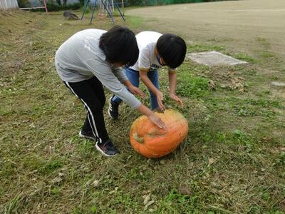 10月3日(月)、学校の畑で育てていたジャンボかぼちゃを収穫しました。今年は全部で三つです。例年より小ぶりということでしたが、重さは普段食べているかぼちゃの十数倍はあり、児童だけでは持ち上げられず転がして運びました。児童と一緒に写真を撮ると堂々の貫禄、思わず見惚れてしまします。収穫したジャンボかぼちゃは、ハロウィーンに向け、ジャック・オー・ランタンに加工する予定です。